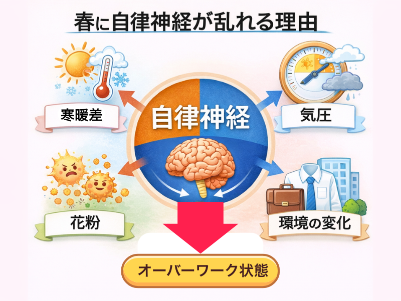特に春は、気温・環境・生活リズムが大きく変わる季節です。そのため自律神経にかかる負担が増え、体調不良が起こりやすくなります。